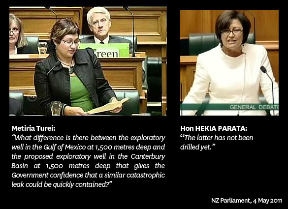 Mr Pfahlert claimed the industry has a spotless safety record, then when reminded of just two recent rig spills in Taranaki he acknowledged there have been more than minor spills in New Zealand. He neglects to also say that Taranaki drills are based in an average of just 150 metres of water. The Raumkumara Basin permit allows drilling in depths of up to three kilometres, the same as the Montara well. The Deepwater Horizon exploratory well that blew out last year was only half as deep.