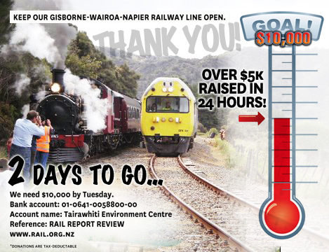 If anyone wants to make a donation towards the report review, they can make a bank deposit at ANZ or online, the account number for donations is 01-0641-0058800-00. Cash or a cheque can be sent to PO Box 1376, Gisborne 4040 (cheques should be made out to Tairawhiti Environment Centre, but enclosing a note that the donation is for the Rail Report Review). Tairawhiti Environment Centre is a charitable entity, so donors should include their name and address, so they can be sent a tax deductible receipt.