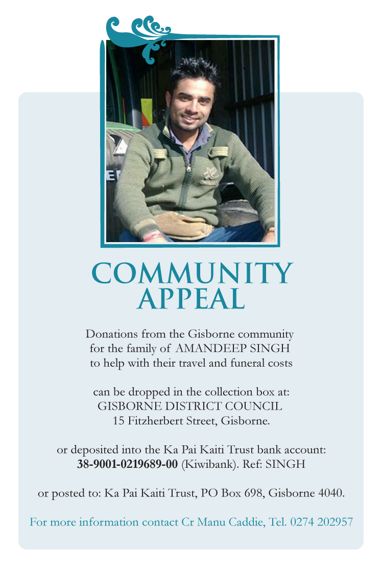 Contributions can, from Tuesday, be dropped into the front counter at Gisborne District Council in Fitzherbert Street, can be deposited into the Kiwibank account of Ka Pai Kaiti Trust (reference: SINGH) or may be posted to Ka Pai Kaiti Trust, PO Box 698, Gisborne 4010 with a note that it is for the family of Mr Singh. Donations can also be deposited into the Ka Pai Kaiti Trust bank account: 38-9001-0219689-00 (Kiwibank). Reference: SINGH.