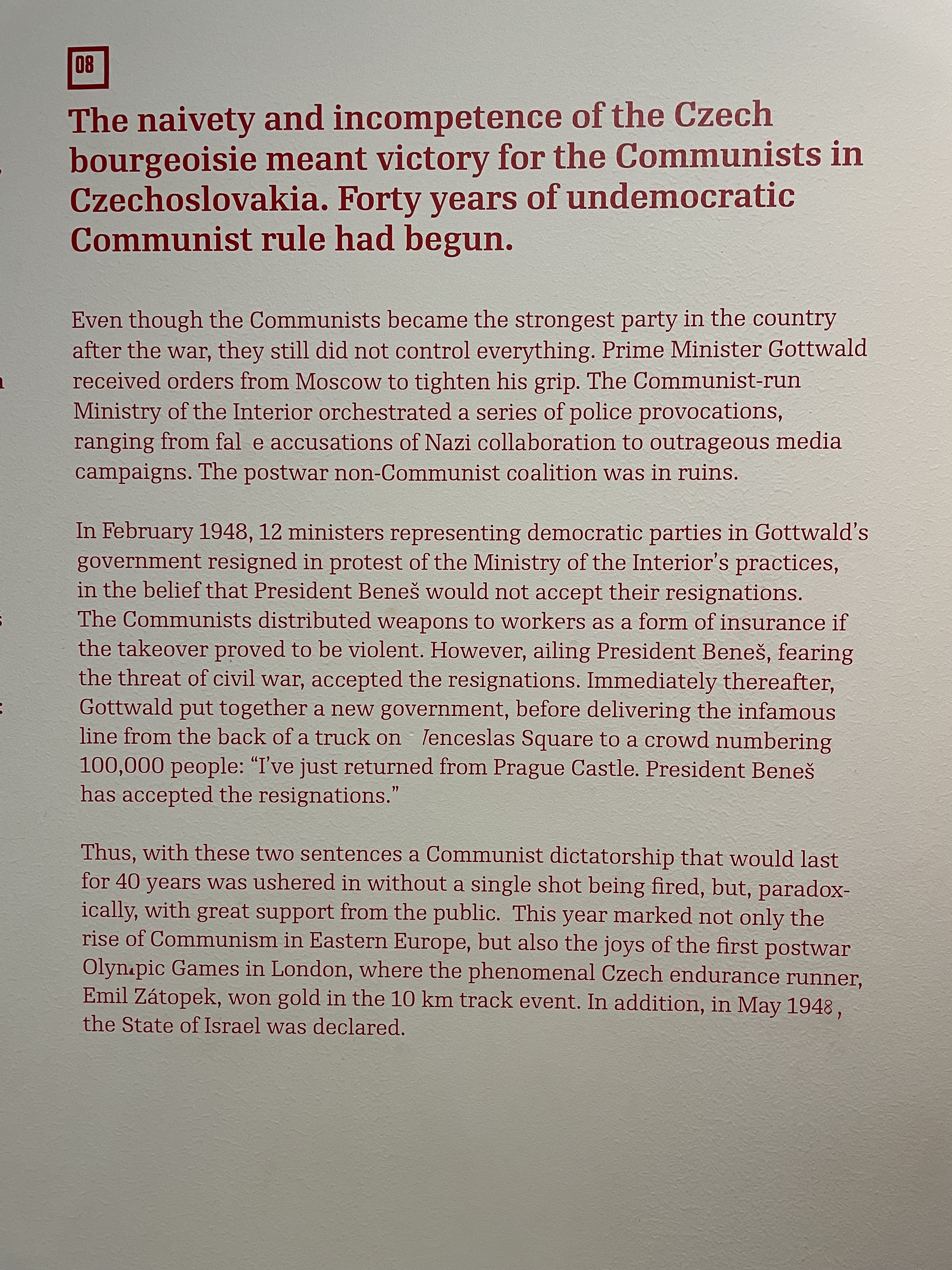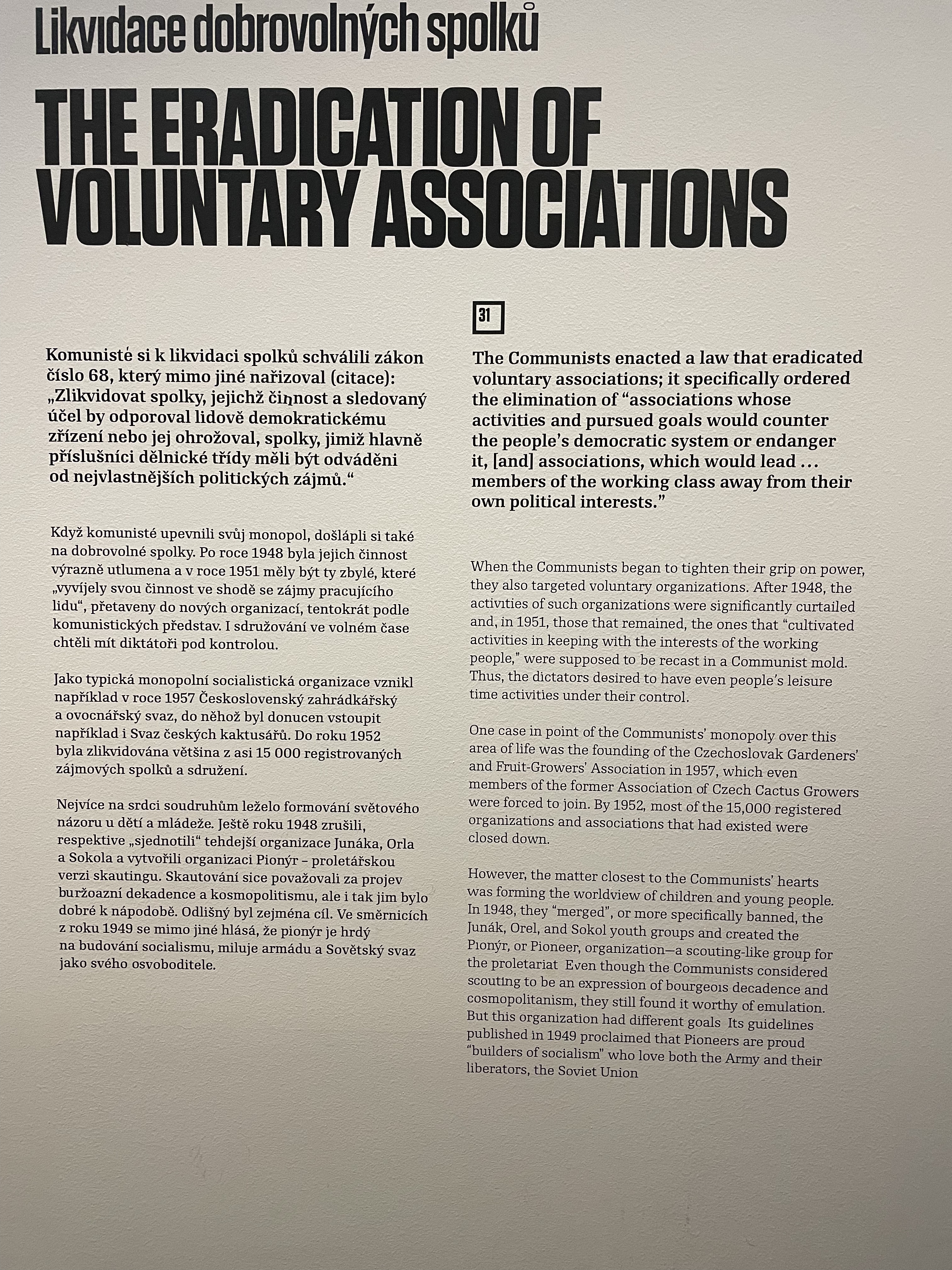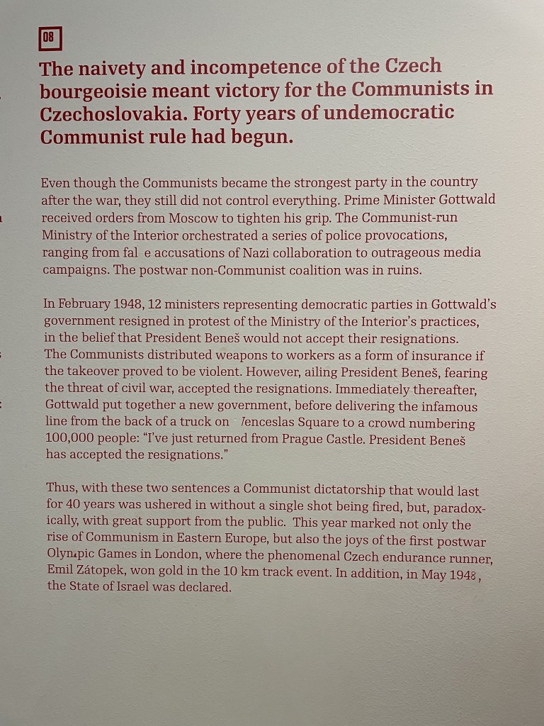 The story became increasingly bleak covering many aspects of daily life under Communism, the challenges for everyday families after the devaluation of the currency in 1952, and deterioration of civil liberties and an eventually outright murderous government under de facto Soviet control. The exhibition ends with the increasing resistance to Communism from the late 1960s and the eventual peaceful revolution in 1989 that ended the Soviet Union, in many ways initiated and led by Václav Havel. The Czech poet and playwright served as the last president of Czechoslovakia from 1989 until the dissolution of Czechoslovakia in 1992 and then as the first president of the Czech Republic from 1993 to 2003 and was the first democratically elected president of either country after the fall of Communism.