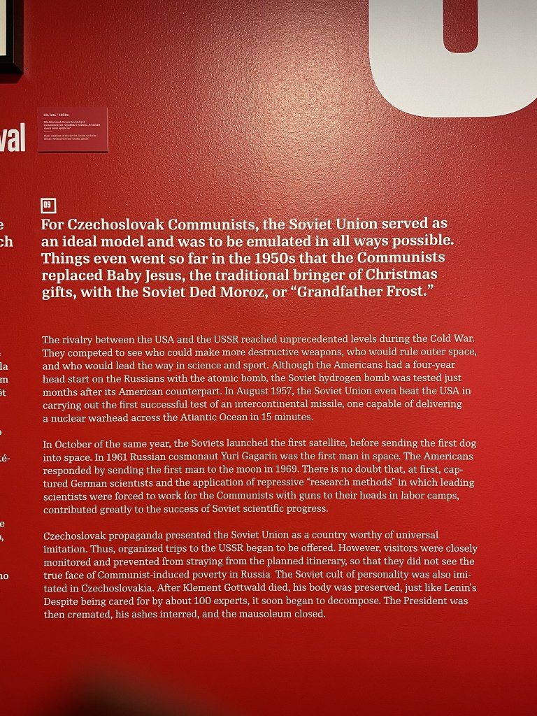 A specific example of constructive historicism I experienced was in Prague at the Museum of Communism. I wasn’t sure what to expect at the museum – other than it would likely be an effort to portray the period in Czech history in a wholly positive or wholly negative light – and probably of low quality in terms of displays and commentary. I was pleasantly surprised to be wrong about those assumptions.