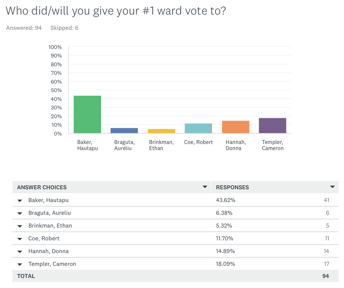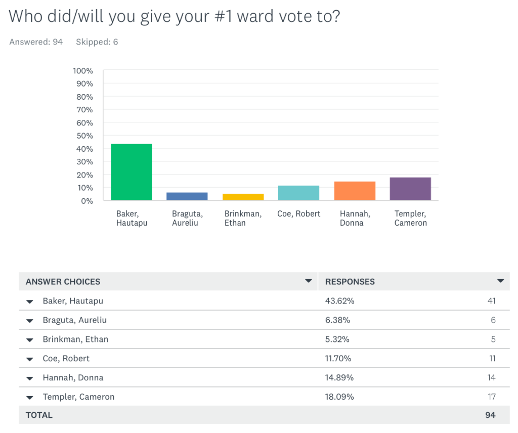 At least they were honest… We got a good spread of residents, Maungatapu is probably over-represented. Apparently a walking group of older residents were having coffee at The Fat Cat Cafe and all completed the survey there.I’ve been supporting Hautapu Baker, so this is pleasing, but Maungatapu is probably his strongest ward, so the over-representation there may have skewed the results in this question.This is the most interesting – but it is consistent with similar polls I put on Facebook community groups a couple of weeks ago for Pāpāmoa, Arataki, Mount Maunganui, Maungatapu and Welcome Bay communities.